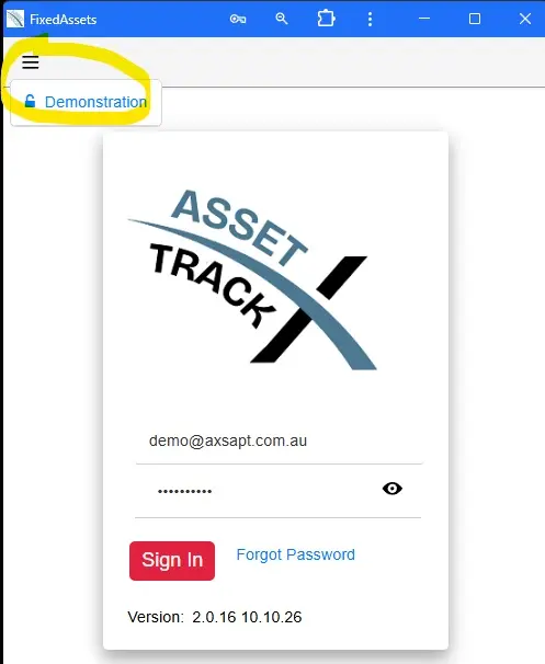 To log in and view the demonstration data, click on the hamburger menu and the user name and password will be entered for you.