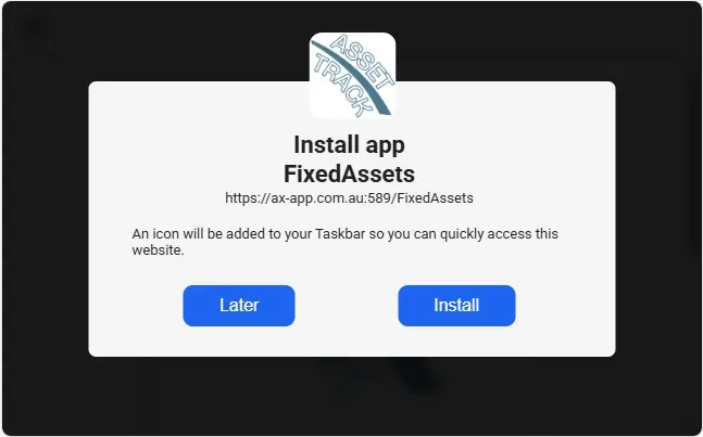 If you choose Later, you will run Asset Track directly from your internet browser. However if you choose Install, your browser will install Asset Track on your desktop and optionally on your Taskbar.