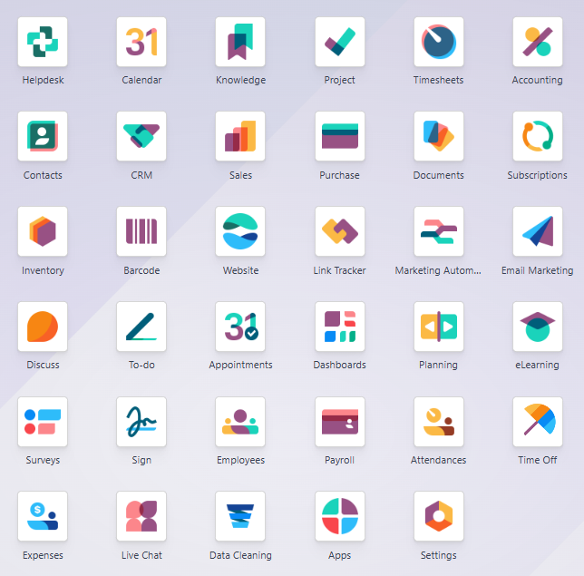 We were so taken aback by Odoo's capabilities that, at Axsapt, we replaced our Accounting, Bank Feeds, Help Desk, Website, Project Management, HR, Online Ordering and other functions with just Odoo. The following image shows all the Odoo functions we use to run our operations.
