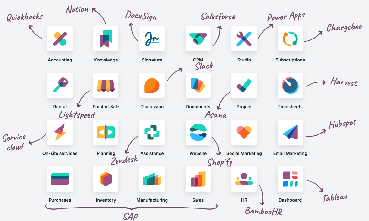 Are you using many applications over the capability of your current ERP system? Look at what functionality Odoo includes in one low per user pricing: