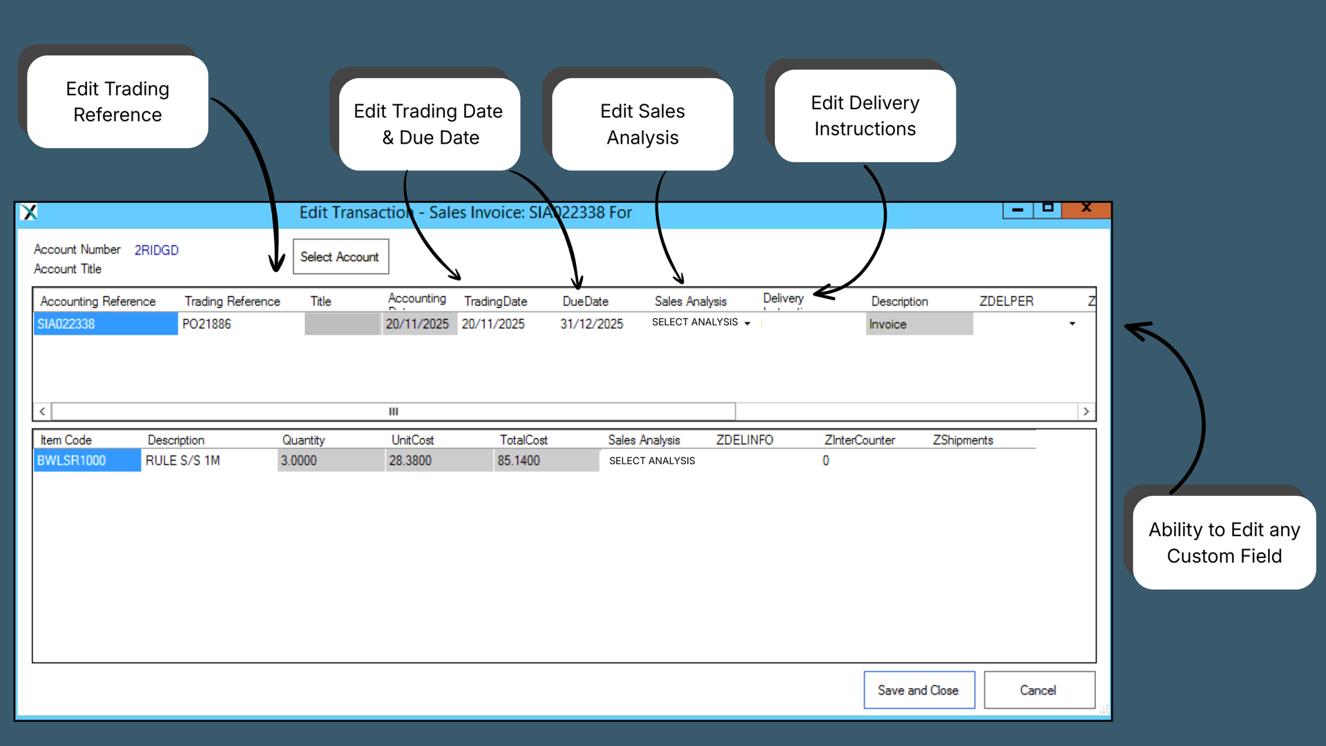 With this powerful utility, changes can be made to non financial, non critical fields. Saving you the hassle of having to reverse and re-enter transactions to make what are often only minor changes.